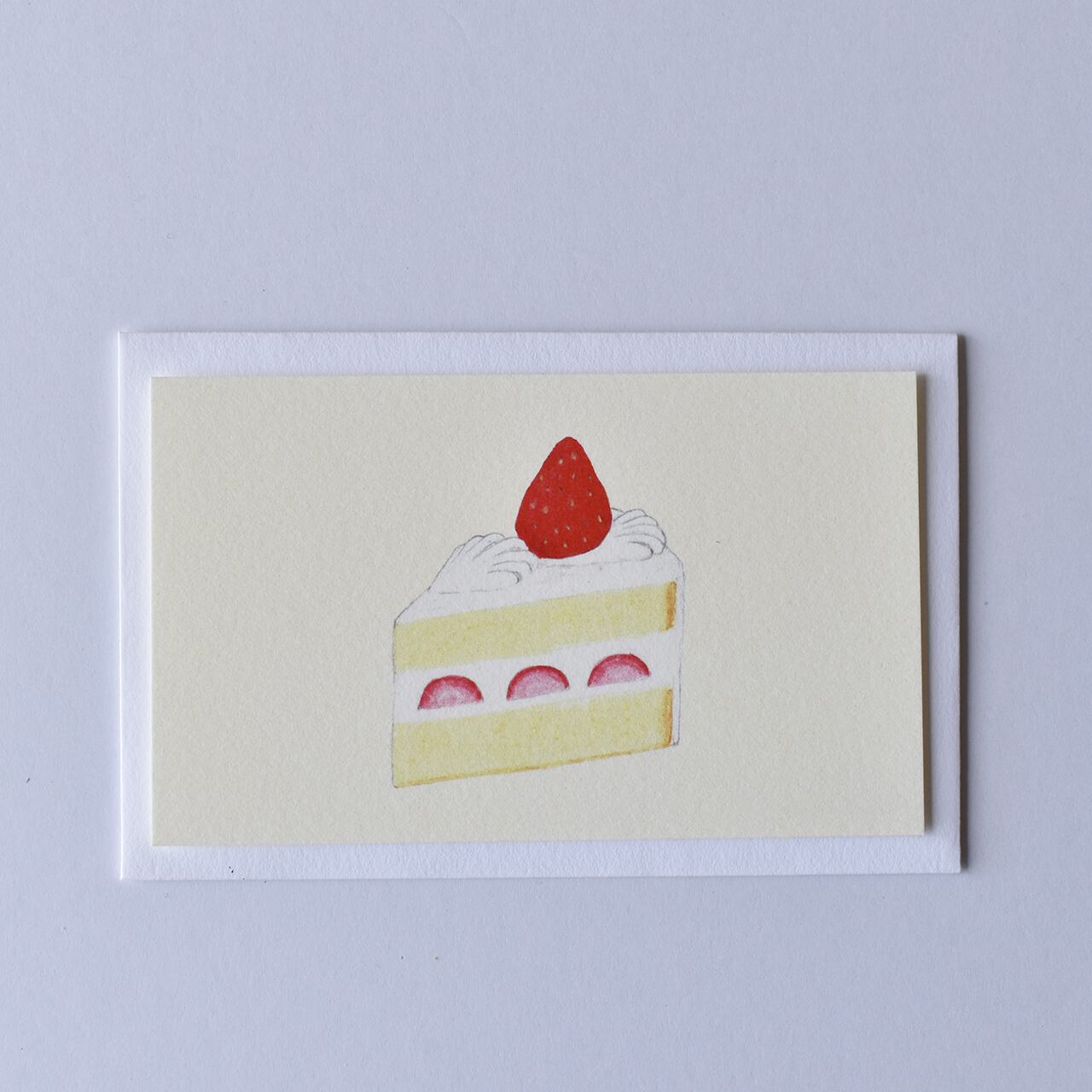 苺のショートケーキのイラストで小さなメッセージカード、白い封筒とセットです。